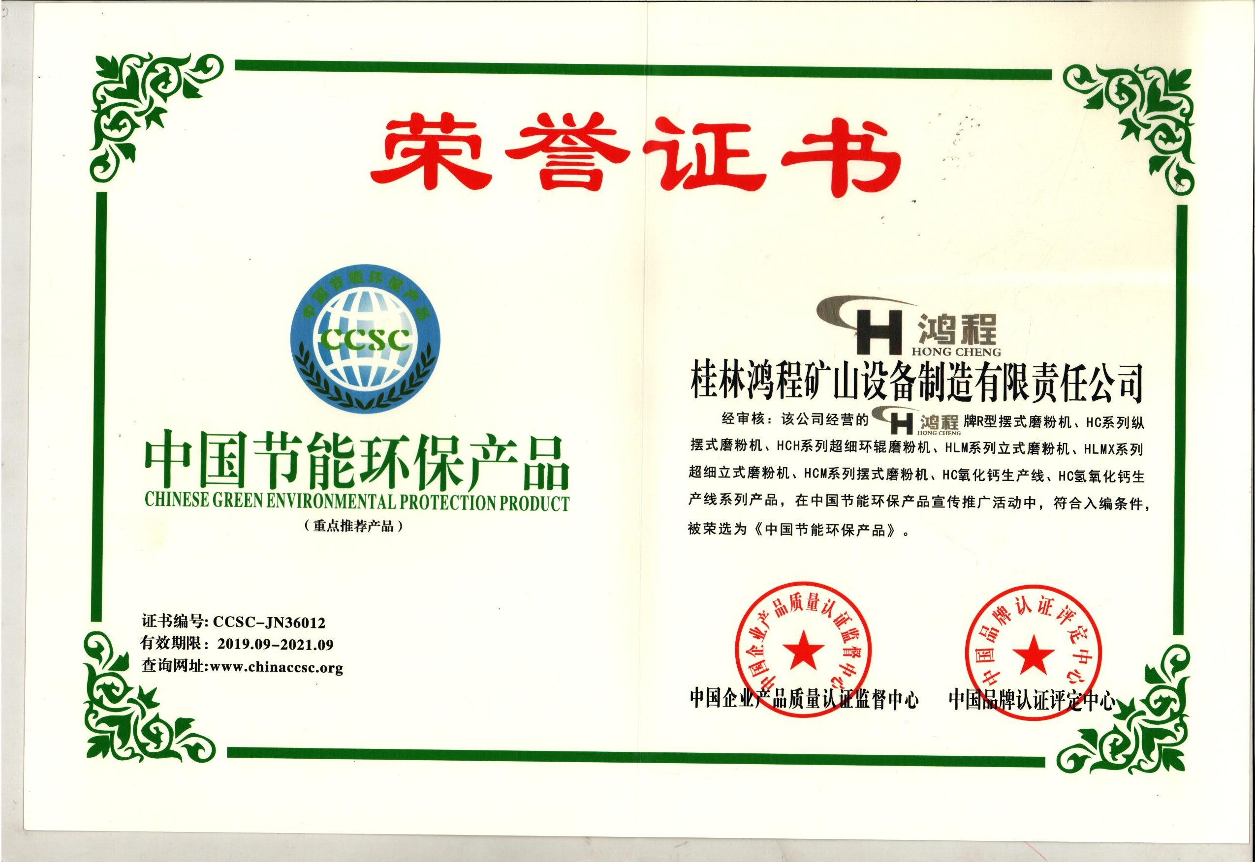 桂林鴻程是業內知名的碳酸鈣磨粉機廠,我們生產的雷蒙磨、超細立磨、環輥磨、砂粉一體機等重質碳酸鈣生產設備在重質碳酸鈣及填充母粒清潔生產中得到了廣泛的應用。設備節能環保,收塵率高,配置的脈沖除塵器可將收塵率提高至99.9%,有效提高了重質碳酸鈣及填充母粒清潔生產率。經審核:公司經營的鴻程牌R型擺式磨粉機、HC系列縱擺式磨粉機、HCH系列超細環輥磨粉機、HLM系列立式磨粉機、HL MX系列超細立式磨粉機、HCM系列擺式磨粉機、HC氧化鈣生產線、HC氫氧化鈣生產線系列產品,在中國節能環保產品宣傳推廣活動中,符合入編條件,被榮選為《中國節能環保產品》。